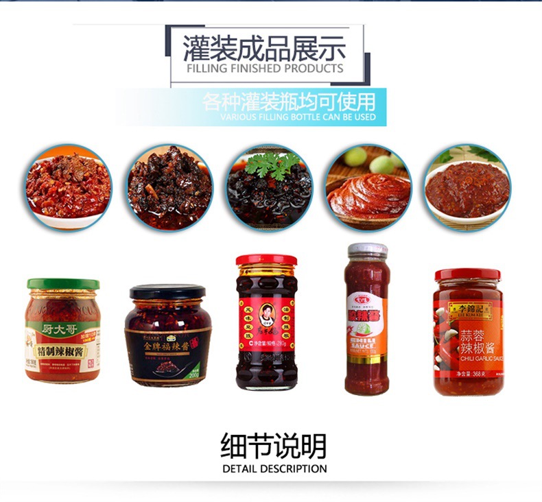 全自动酱类灌装机几乎能够灌装所有酱类、酱料物体是该款全自动辣椒酱类酱体灌装生产线大的优势,包括大块肉酱、颗粒酱、浓酱、豆瓣酱、甜面酱、辣椒酱等。