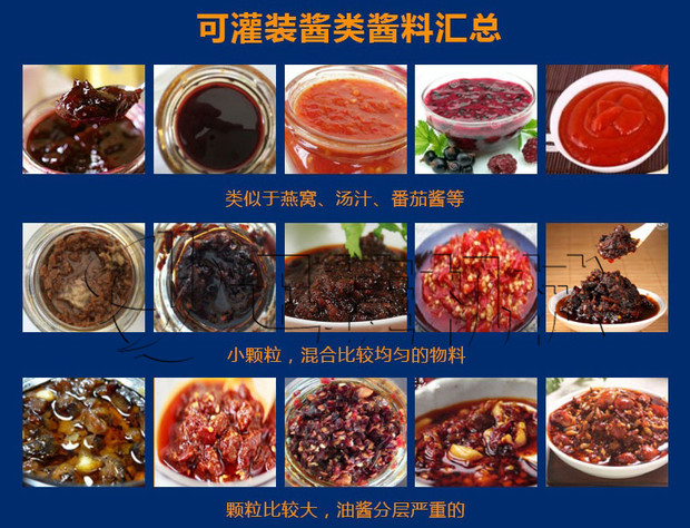 2.双头颗粒酱料灌装机采用横推料的方式,大大缩短了下料斗到灌装头的距离,提高了灌装速度,更重要的是解决了含油量大的物料在灌装过程中出现的有些瓶油多,有些瓶酱多的灌装难题,大大提高了灌装精度。